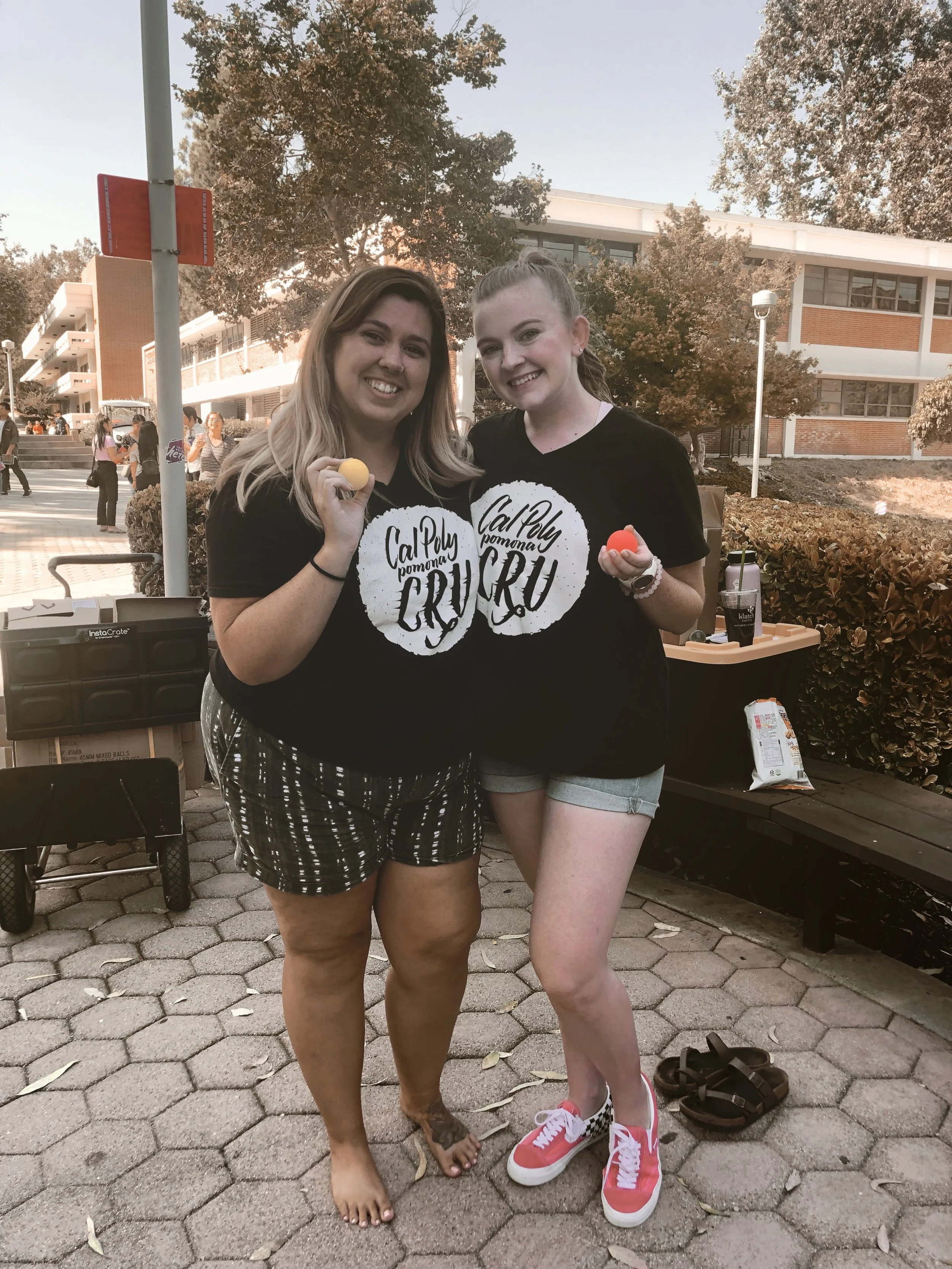Former Cru member Rachel Duryea (left) and a friend sporting shirts from Cru’s chapter at California State Polytechnic University, Pomona.